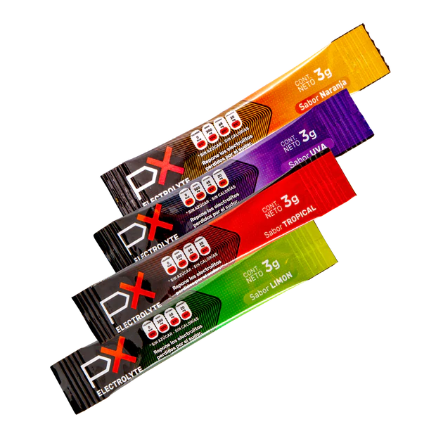 Con solo agregar un sobre de PX ELECTROLYTE en 600 ml de agua se logra una adecuada hidratación, sin calorías, para consumir antes o durante la actividad física.